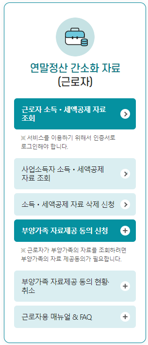 연말정산 간소화 자료를 확인하려면, 국세청 홈택스 웹사이트에 접속하여 '장려금, 연말정산 전자기부금' 섹션에서 '연말정산간소화'로 이동한 다음 '근로자 소득, 세액공제 자료 조회'를 선택하면 됩니다.