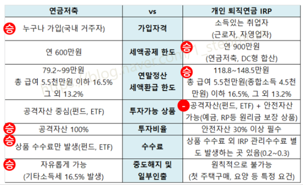 - 공통점: 연금저축과 개인형 퇴직연금(IRP) 상품 모두 노후 대비를 위한 장기 투자 상품이며, 세액공제 혜택을 제공합니다.