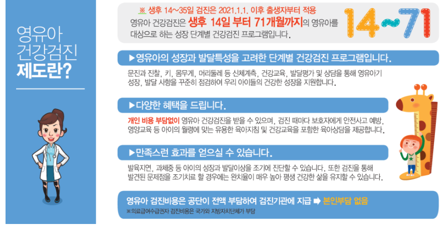 영유아건강검진 시기은 아이의 건강과 발달을 주기적으로 확인하고, 필요한 경우 조기에 대응할 수 있도록 돕는 중요한 과정입니다. 이 영유아건강검진 시기는 생후 초기부터 시작하여 유아기 말까지 여러 차례에 걸쳐 진행됩니다. 각 영유아건강검진 시기는 아이의 나이와 발달 단계에 따라 정해져 있으며, 다음과 같이 구분됩니다.