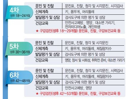 - 생후 54~60개월 검진: 이 검진은 아이가 학교에 입학하기 전 중요한 시기에 실시됩니다. 인지 및 언어 발달, 사회성, 신체적 성장 및 건강 상태를 전반적으로 확인합니다.
